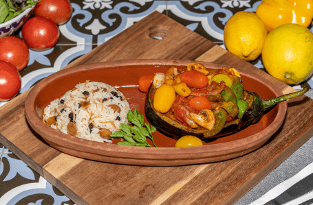 March 7, 2022Stuffed baby eggplant with village style large fried vegetables topped with fresh herbs and thick traditional tomato sauce, served with…
