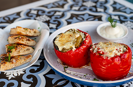 March 7, 2022Traditional white rice with tomato and pepper paste stuffed in capsicum, served with garlic yoghurt and home made Turkish bread